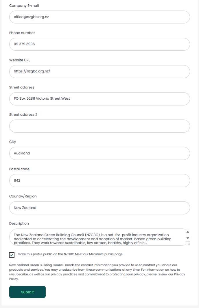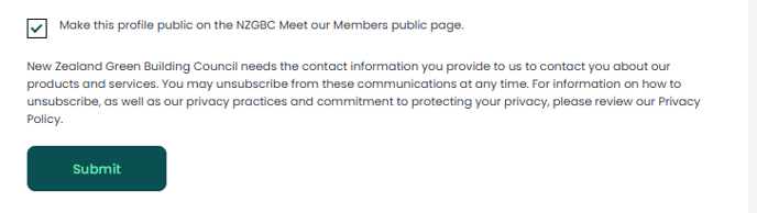 - Make This Profile Public: You can select the checkbox labeled "Make this profile public on the NZGBC Meet Our Members page" to make your company profile visible in the NZGBC Member Directory. By checking this box, your company will be featured on the "Meet Our Members" page, where others can find and connect with your business.